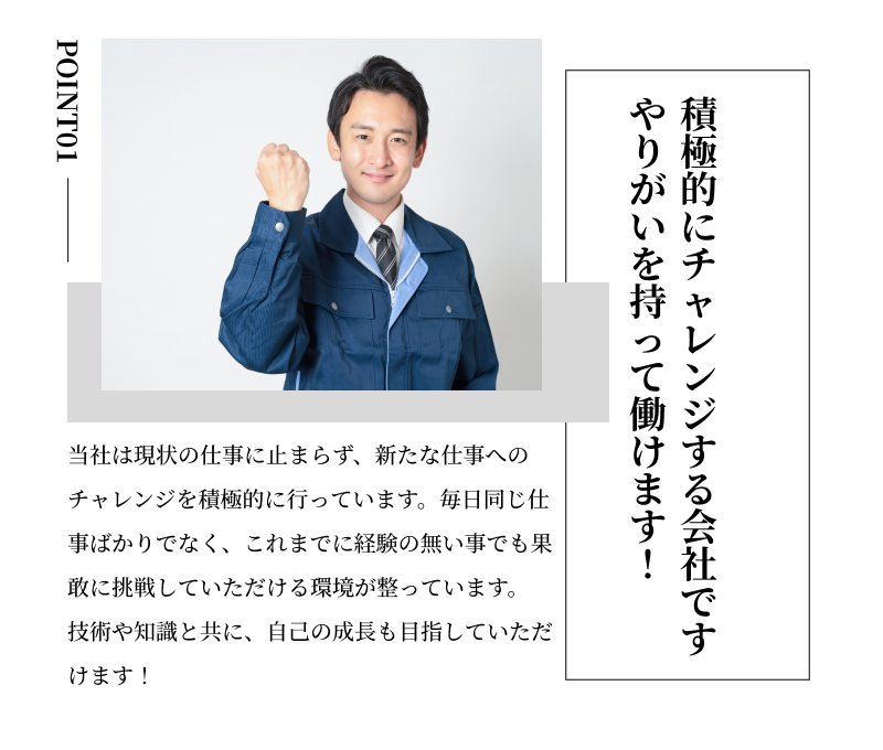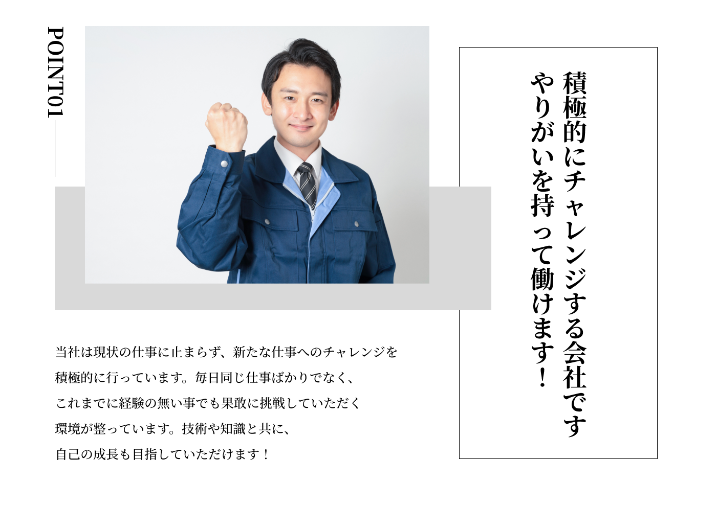 当社社員により入念に教育・指導の元に技術を覚えていただきますので、熱意を持って仕事に望んでいただける方であれば問題ありません。