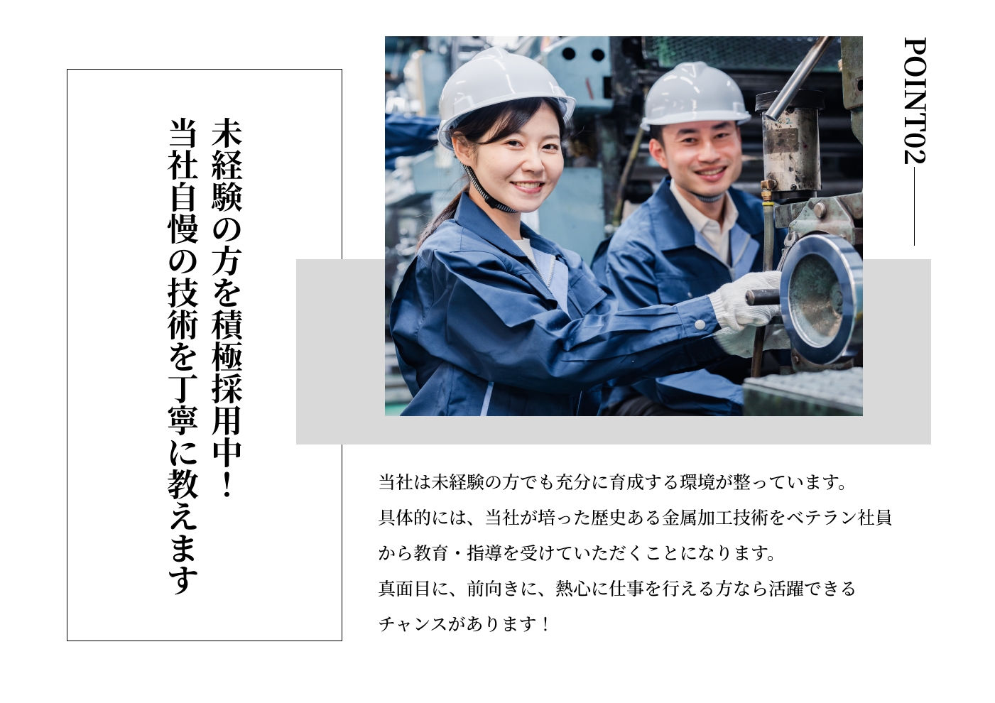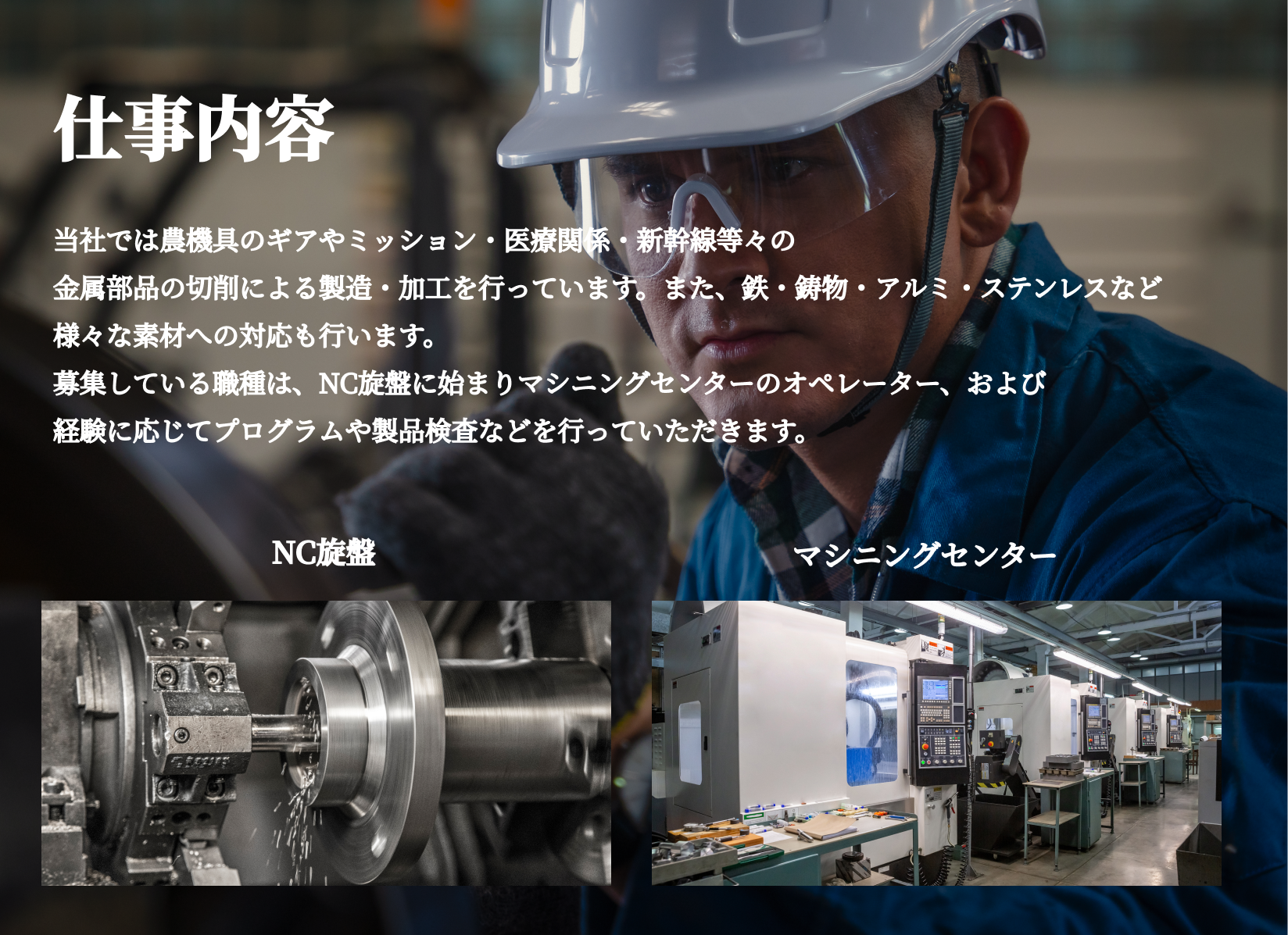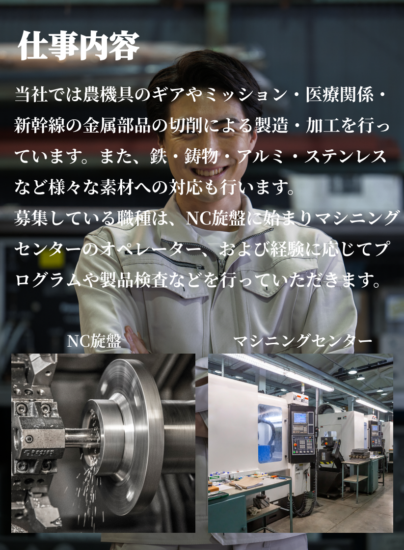| 事業内容 | NC旋盤・マシニングセンター金属加工 (農機具・自動車・産業機械等の部品加工) |