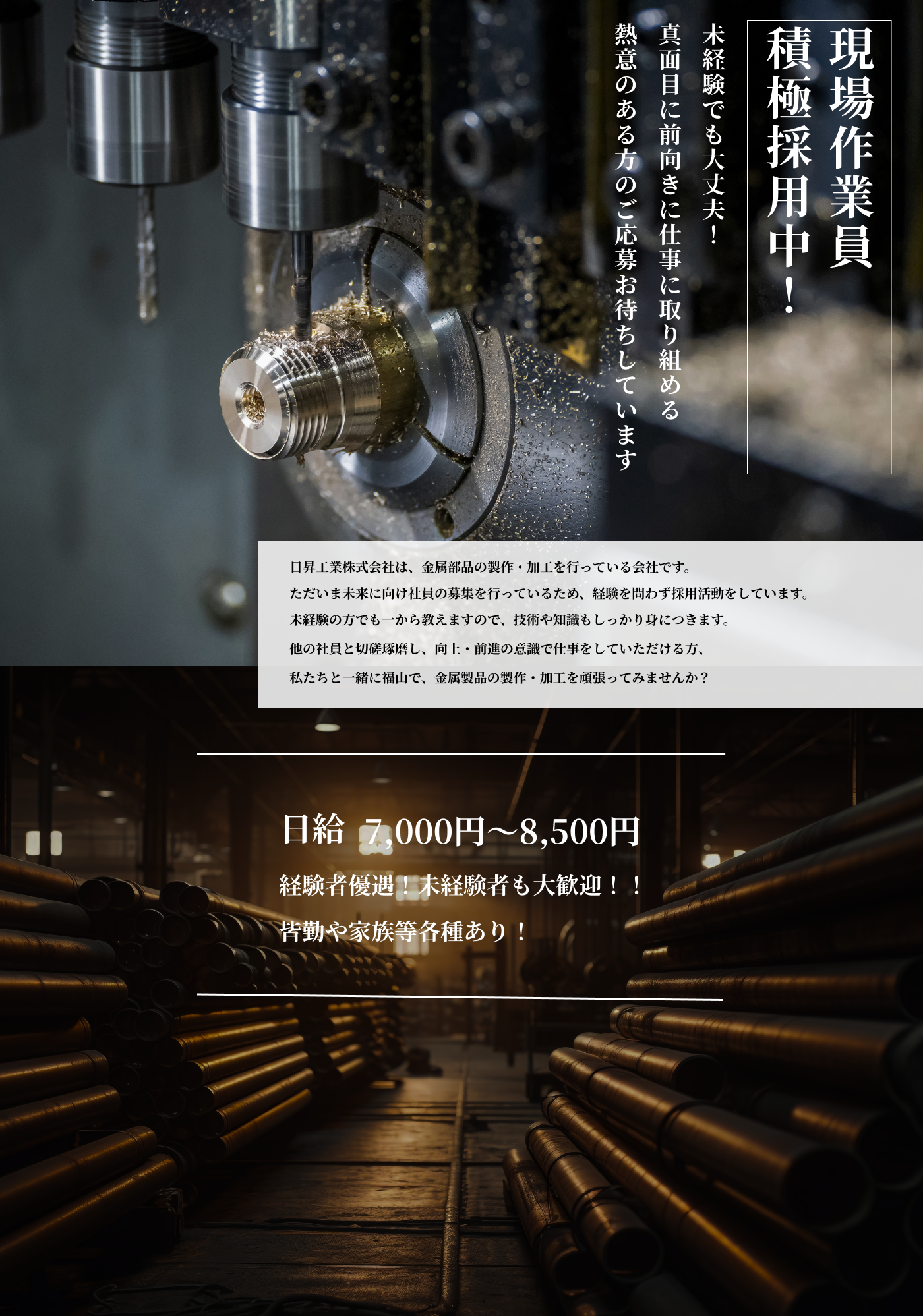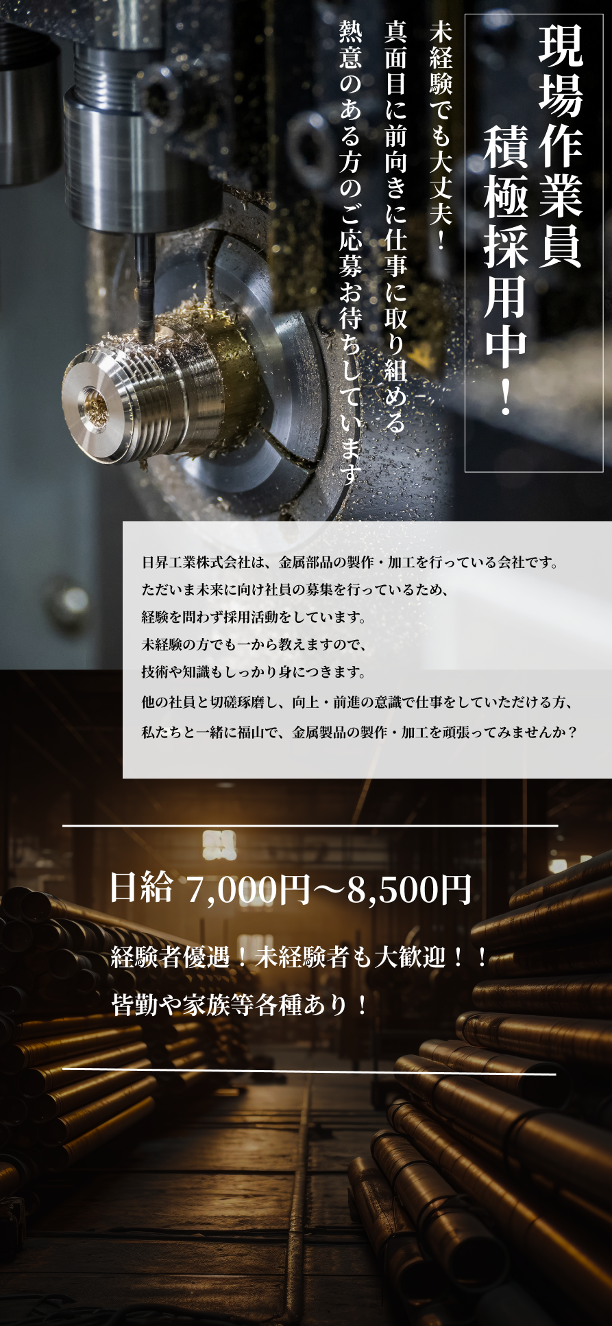 現場作業員 NC旋盤・マシニングセンターのオペレーター及び経験に応じてプログラムや製品検査などを行っていただきます。 |